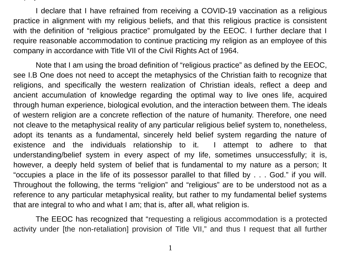 Not Adahn’s response [ed. Given the month lead time to pubs, this will probably be lost to the sands of time – May 23rd ish] to Pie on religious exemptions to the covid shot mandates got me thinking what a ‘religious’ objection means. Does one need the metaphysics of religion to ‘properly’ seek a religious exemption? From the context of the comments, I’m assuming NA saw Pie’s objection to the religious part of the exemption as a dislike of religion and saw the religious nature as integral to a valid exemption request. Paraphrasing, religion puts some things above the state, and therefore is necessary otherwise it’s just whatever the individual wants. I don’t think you need religion to put something above/outside the state though. The religious exemption legally does not require – explicitly rejects in fact – that one adhere to a specific religious doctrine or metaphysics. Just that the objection is a sincerely held belief that influences and directs the persons everyday life; it is integral to their ‘being’. To me, the minarchist view of the relation between state and individual satisfies that criteria and places the individual above the state. That perspective is how I crafted my exemption. Is that a ‘religious’ perspective? Perhaps, but not in the commonly understood meaning of the word. More briefly, adherence to religion in the commonly held notions of what that means should not (and is not) a requirement for exemption. Appropos of nothing…