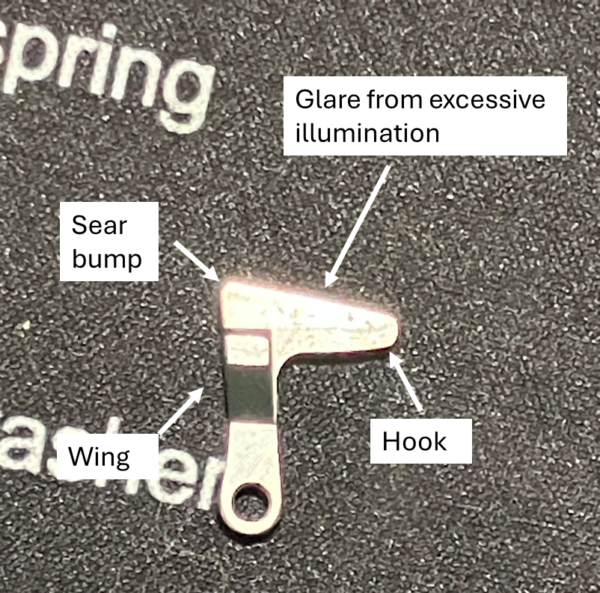 So I took it to the gunsmith, who is clearly on the spectrum in a useful way, and he tells me the sear wear isn’t anything to worry about, and more importantly — the problem was not my fault! The issue is with the new part itself. Remember how I pointed out the hook pulls the trigger back along with the hammer? Well, trigger snobs/prima donnas/stubby fingered folk think that the trigger goes too far forward when the hammer is down. The company that made this disconnector also makes one with a thicker hook that prevents the trigger from going forward all the way, which they call a “reach-reduction” trigger. I specifically did NOT buy that one, but apparently I got one. That part requires fitting by filing down the hook until it’s small enough to allow the trigger to go back all the way.