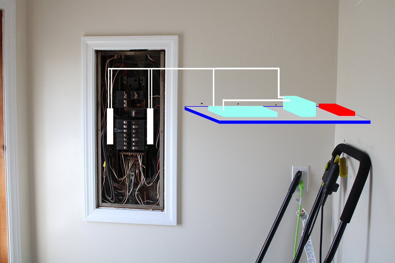 This is just a draft visualization to give some idea of how it would be laid out. The exact sizes of each component are obviously not taken into account since none of them exist yet. I expect the platform will be a wire shelf so that I can lay the heat exchanger flat and push the air upwards through it. And the exact path of the coolant tubes will be different. I debated putting the heat exchanger in another room entirely, but concluded that I don’t need to make the space cold, just cool enough that the breaker doesn’t trip from the AC usage on hot days. Since just opening the panel helped end the problem, just moving the heat away from the breakers should be enough.