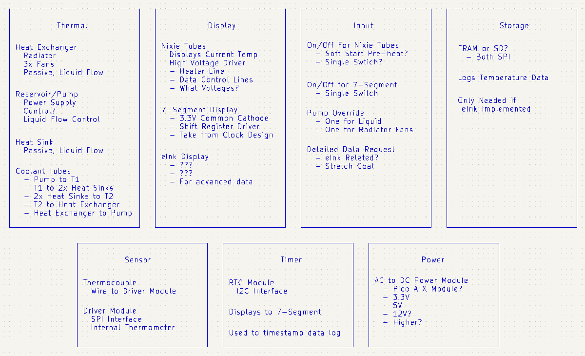 Almost all of the other systems in the device will be bespoke, designed and built to suit. Some off the shelf components are available. The power supply will err towards off the shelf for safety. Since I already have driver modules and real-time clock modules, those will go into the sensor and timer systems. Anyway, I identified seven major systems to be worked on.