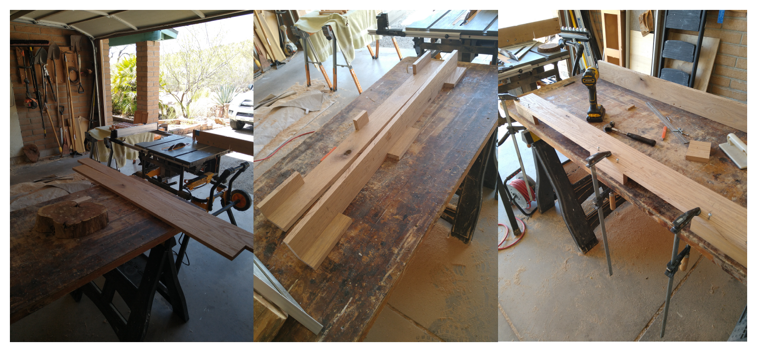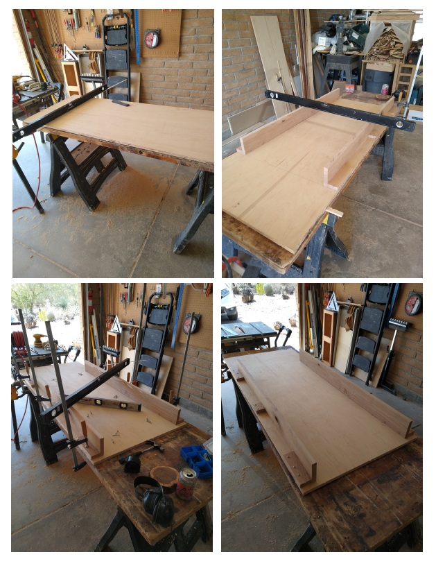 With the side rails assembled and the base cut out, time to attach the rails to the base. In principle, if we’ve been careful and have flat and true stock for the rails, we should be able to just attach the rails. Being OCD, checked it. I first shimmed up the base so that it was level in all directions. That way, I can just check the rail for level in both directions (long and across the base) for level and be assured that the rails and base are square to each other. With the base leveled out, I can attach the side rails and and check them for level in all directions. Once everything is verified, I can attach the side rails to the base. I did NOT use glue here, but just some pre-drilled screws so that the rails can be removed and replaced (see the end of the post…. if you can find it down there somewhere in the distance.).