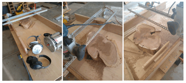 Of course, the key word is ‘flat’. Even if I had real chainsaw skills, which I don’t, getting parallel sides on a cookie with a chainsaw is not really doable, and without the skills, laughably impossible. But to do anything with these pieces, one really needs them flat and parallel. And looking at the beautiful grain and figure, I really wanted to get something nice out of them, even if I have no idea what the final product will be. Therein lies the rub(bing of the wood) – how do you get flat parallel sides? Wood workers have jointers and planners to do that very job, but very few of them are large enough to accommodate large, oddly shaped pieces. To say nothing of the fact that since you would be running the end grain of the material across the cutting knives, you are more likely than not to, at best, create wavy, sniped surface and at worst (and highly likely) create very high velocity high caliber wood bullets as the piece comes flying back out at your face and/or groin depending on your stance relative to the feeder.