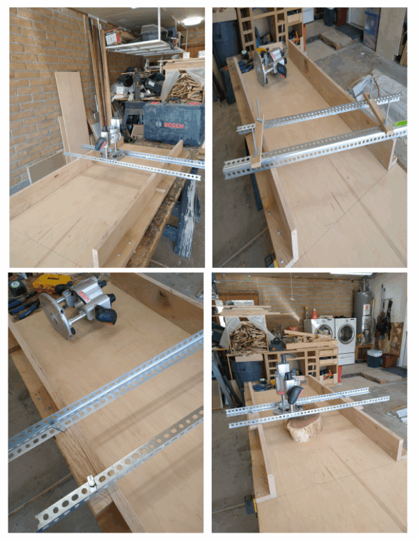 So how does one flatten these larger, oddly shaped end pieces? Well, one can buy a router flattening jig. The basic idea is to affix rails to a large flat bed and run perpendicular rails that can support a sliding router – like nyah and nyah. One can then place larger end grain materials on the bed, place a router on the perpendicular supports and drop the router bit to just make contact with the surface you want to flatten. Said perpendicular supports can slide along the rails as well as across the bed; by moving the router along both axes, one can make a pass across the surface, removing material parallel to the bed and thus, with multiple passes of increasing depth, flattening the surface. The only requirement is that both side rails and the rails supporting the sliding router remain parallel to the bed of the jig. Now, as you can see, said jigs are not necessarily cheap. But hell, conceptually they should be easy to build. And I have a bunch good plywood and scrap hardwood left over from the cabinet build, so with minimal cost, I should be able to build my own jig. Right? (incidentally, my kitchen remodel was finished a bit ago – I may write up the transformation/final product if we run short of material upon which to snark).