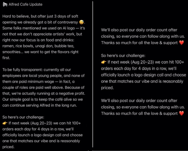 The end of summer in Glibs Gulch (boasting the highest per-capita population of Glibertarians in the US) is marked by the sudden reappearance of thousands of students, parking snafus, frat parties, and the fabulously entitled faculty. This year, it was also marked by the first murder in over a decade and the opening of a rival café about a block away in a space previously occupied by a vegan Korean restaurant owned by someone who became a nemesis of WebDom. That venture was gone within a year, replaced by a “Mexican” venue which lasted perhaps ten months. And now the location has a new café, freshly opened two weeks ago, supposedly selling sushi and ramen. They began life by immediately alienating the entire arts community here by using AI to create all their images and social media marketing material. So in response, they decided to run a contest, which is the equivalent of Jaguar hiring Dylan Mulvaney to fix last year’s fuckup.
