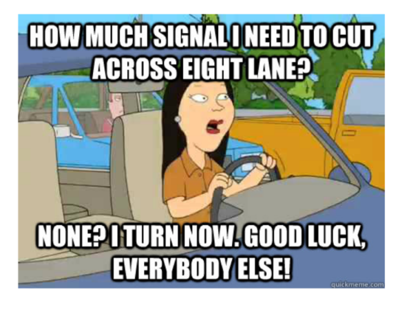 Sometimes it cuts the wrong way, you’ll signal your land change and the guy behind you in that lane speeds up. You have to know the average reaction of drivers in your area.