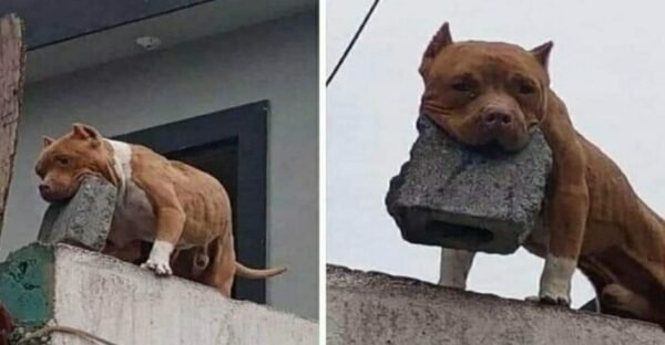 Another has an interesting way of exercising. First, I left a ladder propped against the roof after blowing off accumulated leaves. Rocco found out he can climb ladders. No problem there, until he started carrying his favorite chunk of cinder block with him.
