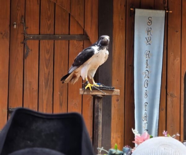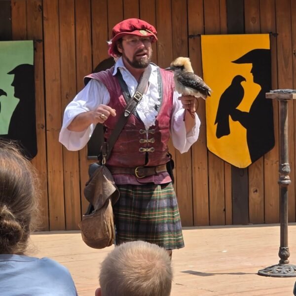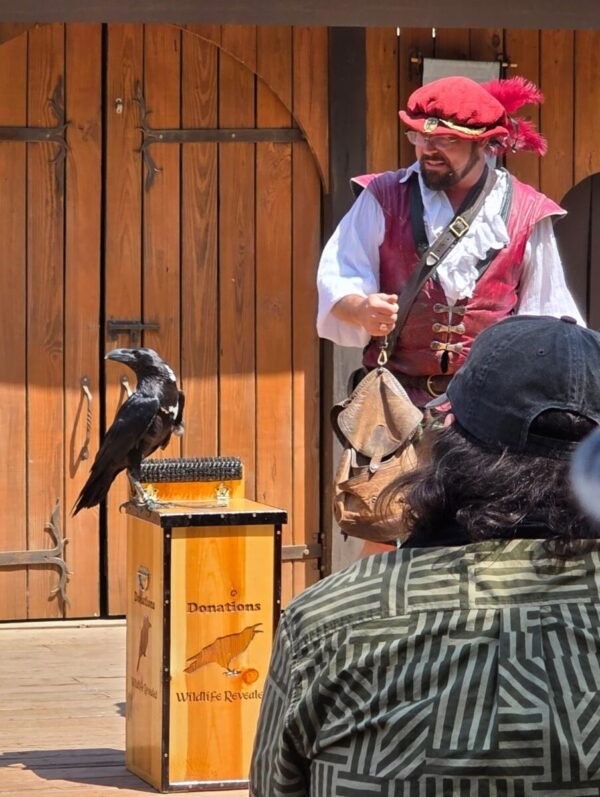 We also sat for a falconry demonstration with several kinds of birds of prey. This was highly entertaining, as there were several perches at the edge of the semicircular arrangement of benches the audience sat upon to watch, so while the handler extolled the virtues of each avian death machine, the birds would fly from the stage out to one of the perches, passing either just over our heads or lower through the aisles, then turn on the perch and swoop back up to the stage for a morsel of cat kibble (probably not made from real cats.) The owl was certainly the most fearsome looking, although I wouldn’t like my chances against any of the birds we saw – hawks, falcons, the lone owl, and a white-necked raven named Ichabod.