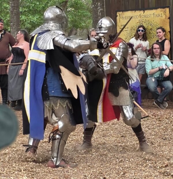 We missed the jousting events that day, but we did manage to observe a couple of knights engaged in armed combat. I used to know someone involved with the Historical European Martial Arts Alliance, but she wasn’t there to critique the event. Still, it was enjoyable to watch two people clonking each other with dulled swords.