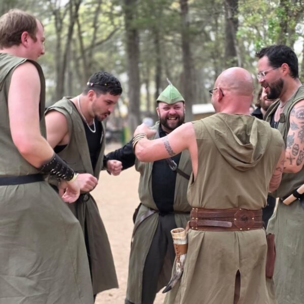Almost immediately after leaving the tent my brother-in-law was accosted by three other fellows wearing the same green tunic as he. They approached him with cheery hoots and back-slaps as if meeting a long-lost comrade. After overcoming a moment of bewilderment, he returned the favor and a hearty laugh was shared before they moved on. My sister lamented at the lack of a picture of that encounter, so we endeavored to catch up to that merry trio. By the time we did, they had found yet another fellow with the same woodsy-green tunic and were repeating their hearty ritual. My sister pushed her husband into the circle and took many pictures of this fivesome as they hooted and laughed while a crowd of onlookers laughed and cheered.