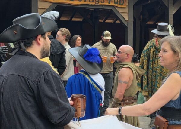 Along with the events and the costume watching, there were assorted minstrels singing or playing instruments, as well as shops and taverns, the latter of which were source of excellent libations from which one could partake. Personally, I most enjoyed the blackberry mead, but there was also a honey mead that wasn’t bad at all. It was while waiting in line for another round of liquid joy that I began to suffer an attack of plumage envy. I had thought my hat would at least be among the most magnificent there, but such aspirations were quickly dashed as I cast my gaze around. I counted no less than six people nearby with large plumes in their hats swaying in the light wind, as if nodding to each other in amusement at my dismal display. I mentioned this sad fact to my brother-in-law and thereupon swore a private oath to rectify this appalling condition forthwith.