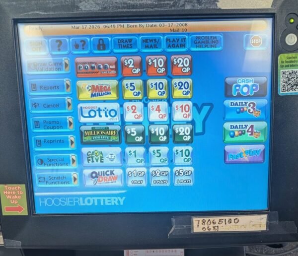 Working the lottery is by far the hardest professional part of the job. On the designated lottery machine, the LottoTron, as I’ll call it, the home screen has buttons for PowerBall, MegaMillions, Hoosier Lotto, Millionaire for Life, Cash Five and Quick Draw. On the right-hand side, there are other buttons for Cash Pop, Daily 3, Daily 4 and Free Play. Pushing those sends you to another screen with over a dozen subset games within. Confusion, complications multiply.